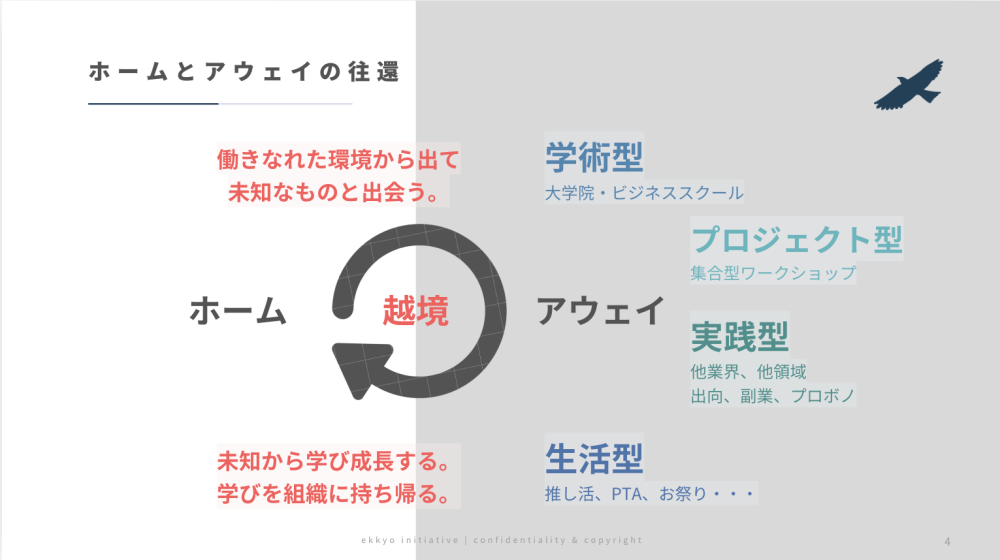 つまり、越境は「未知から学びましょう」というのが一つの側面ですが、その本質として「ホームに帰ってくる」「何を持って帰ってくるのか、戻ってきて何をするか」ということも大事だと考えています。