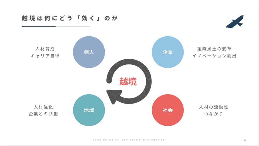 こうしたことを踏まえて考えると、越境には、個人の人材育成、キャリア自律という効果もありますし、企業にとっては、越境研修に行って帰ってきた人が、組織を変えたり、イノベーションの種を持って帰ってきたりするという効果があります。