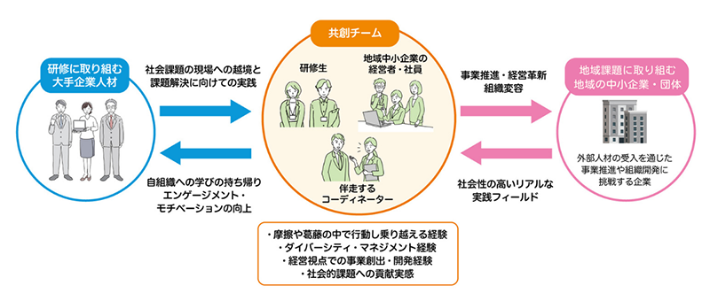 そこで今回は、大手企業社員等がチームを組んで地域課題解決、地域創生の現場に越境し、新たなイノベーション創出に取り組みました。他の大手企業や、受け入れ先の地域企業と共創チームを組み、提案にとどまらない現場での実践経験を行います。