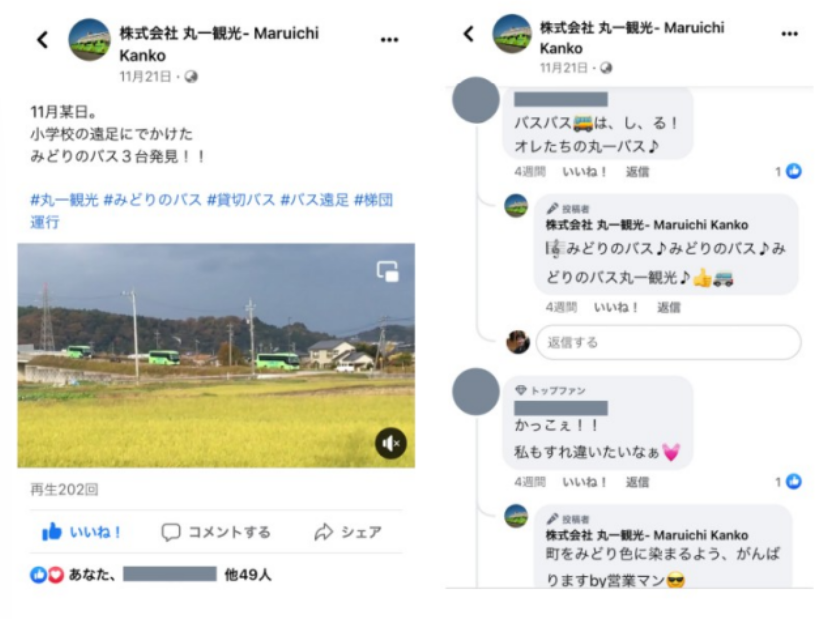 プロジェクトを進めてきた中で、思わぬ副産物もあったそうです。それは、社内コミュニケーションの活性化。例えば、「フェイスブックの投稿に協力してもらいたい」とバスのドライバーに旅先の様子を写真に撮ってきてほしいとお願いすることも。写真で何を切り取るかはドライバー次第で、人柄や感性が浮かび上がる投稿にフォロワーからコメントが寄せられるケースもあるそうです。アイデアを募るために他部署に相談したり、投稿に協力した社員をミーティングに同席させたりと、会社全体を巻き込んで発信に取り組んできたことで、社員も意欲的に協力してくれるようになったといいます。