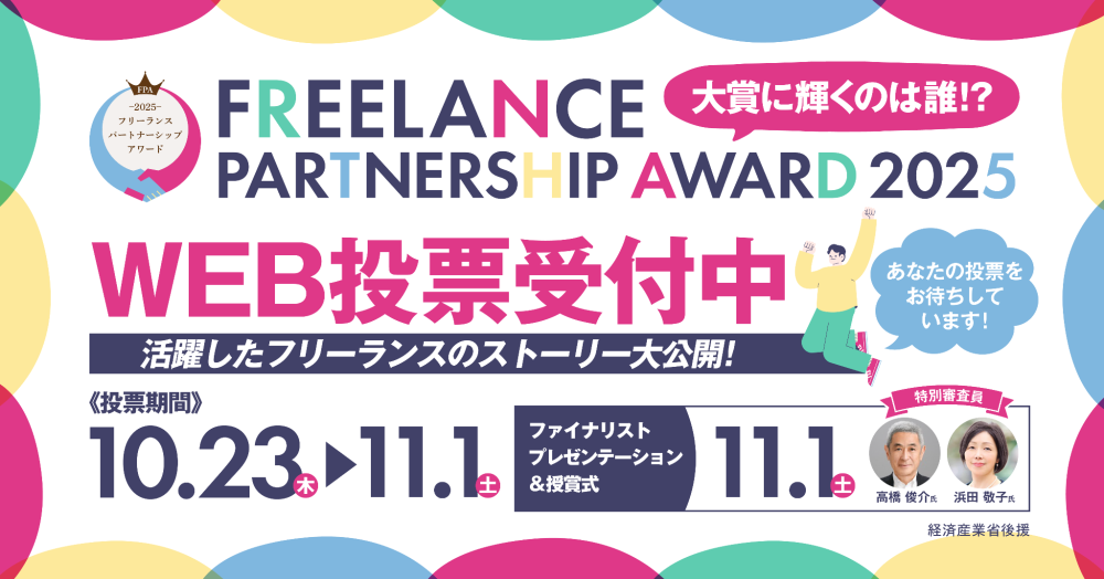 フリーランスパートナーシップアワードは、フリーランス(プロ人材、副業人材など)と企業が良いパートナーシップを築き、チーム一丸となって成果を出したプロジェクトに光を当て、讃えることで、企業がフリーランスをチームに迎え入れることの意義や成果を広く発信するものです。