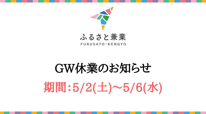 【お知らせ】ゴールデンウイーク休業期間について 2026/04/15 いつもふるさと兼業をご利用いただき、誠にありがとうございます。 さて、誠に勝手ながら下記期間をゴールデンウィーク休業期間とさせていただきます。 2026年5月2日(土)~5月6日(水) 上記期間にいただいたお問い合わせ等につきましては、2026年5月7日(木)より順次ご連絡させていただきます。 ご迷惑をおかけいたしますが、何卒ご了承くださいませ。 皆様、どうぞ楽しい連休をお過ごしください。